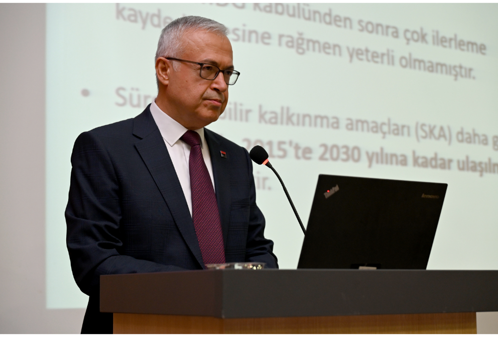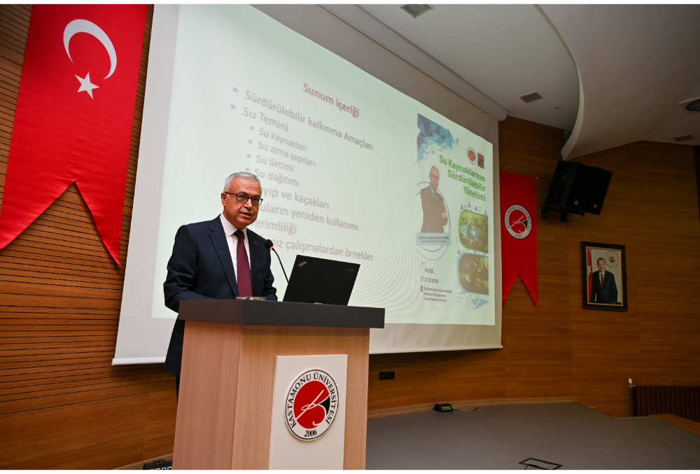 Daha sonra kürsüye gelen Prof. Dr. Aydın, “Su Kaynaklarının Sürdürülebilir Yönetimi” başlıklı sunumunda suyun yaşam için temel bir unsur olduğunu vurgulayarak, sürdürülebilir su kullanımının 1980’li yıllarda uluslararası gündeme taşındığını ifade etti.