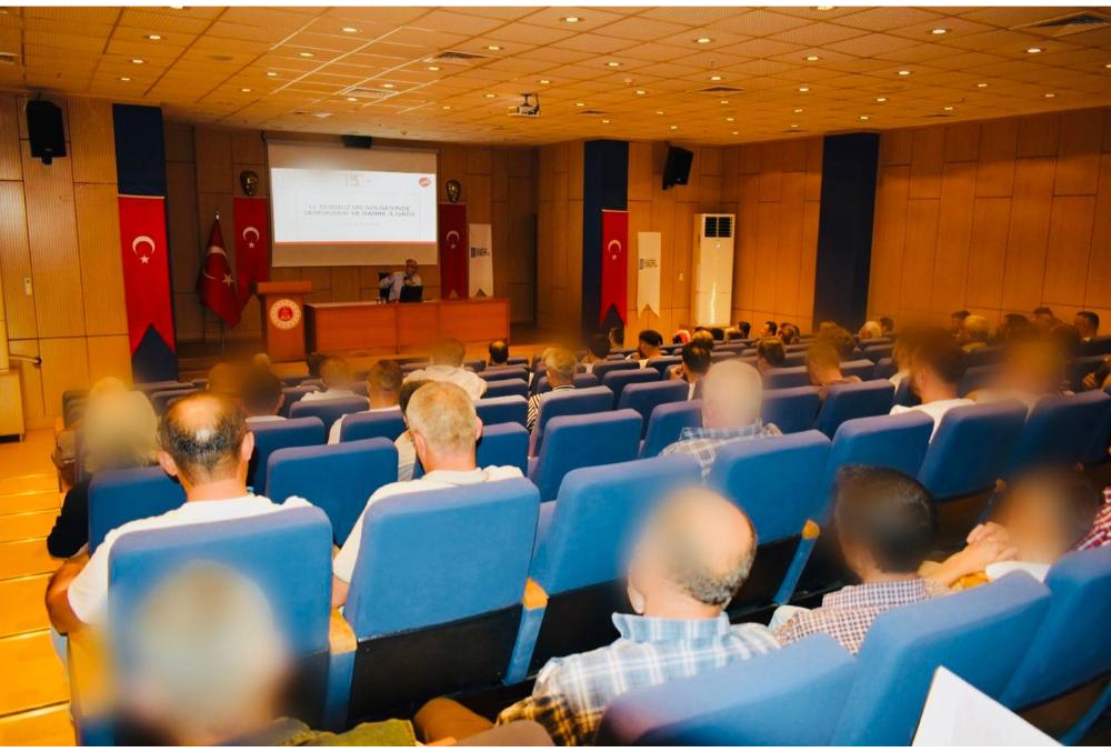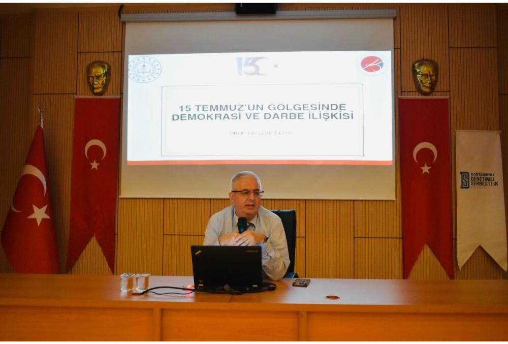 Saygı duruşu ve İstiklal Marşı ile başlayan programda, Kurum Vaizi Fazıl Acar tarafından Kur’an-ı Kerim tilaveti okundu. Ardından Prof. Dr. Demir, Türkiye’de darbelerle demokrasinin tarihsel mücadelesine ışık tutan bir sunum gerçekleştirdi.