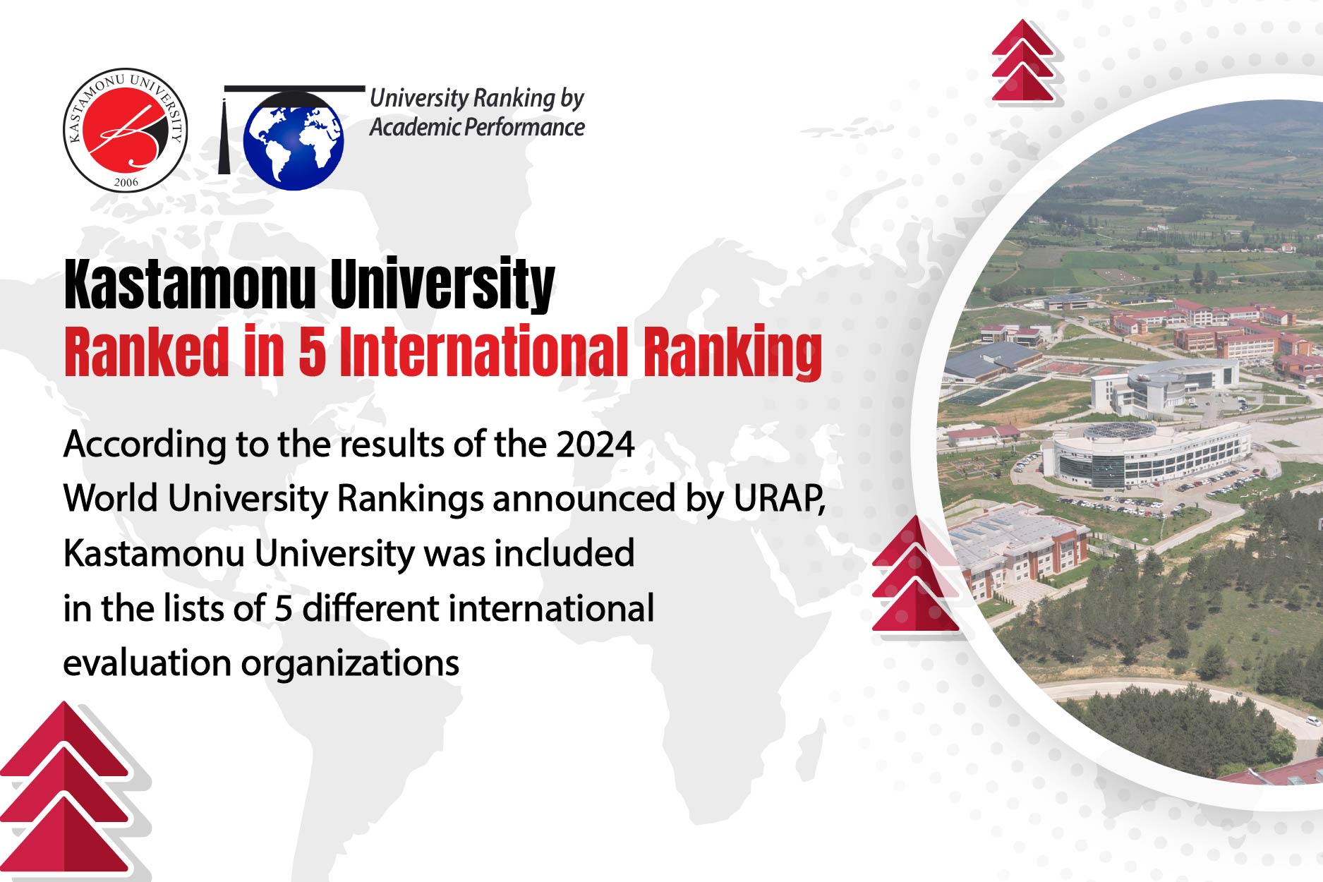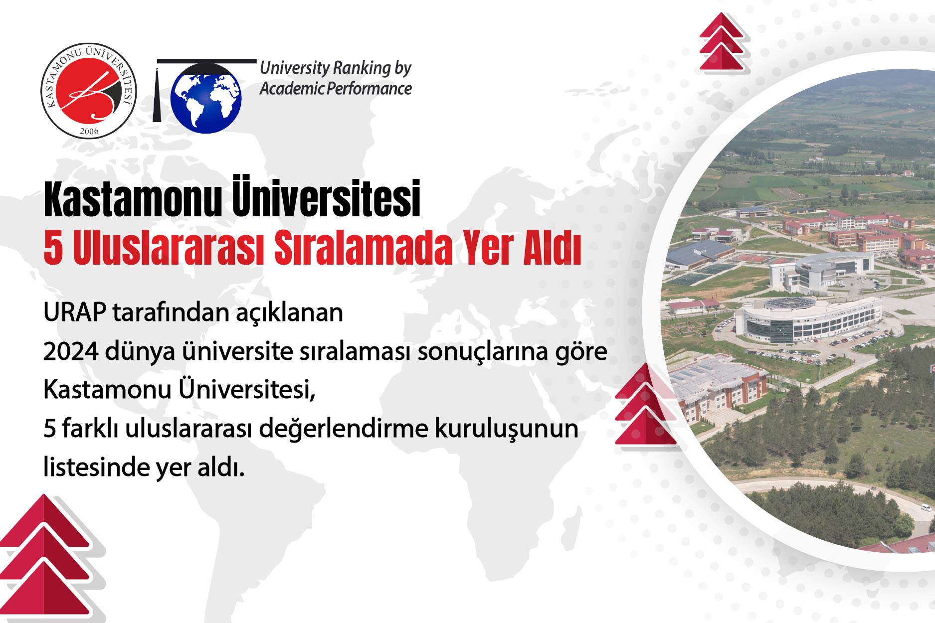 URAP, Webometrics, THE (Times Higher Education), SCImago Institutions Rankings ve US News & World Report gibi uluslararası derecelendirme kuruluşlarının yayımladığı listelerde Kastamonu Üniversitesi de yer aldı. 2024 yılı verilerine göre üniversitemiz; eğitim kalitesi, araştırma ortamı ve uluslararası görünüm gibi kriterlerin değerlendirildiği THE sıralamasında 1501+ bandında, bilimsel yayın kalitesi, makale sayısı ve atıf oranlarının esas alındığı URAP sıralamasında 2164. sırada, bilimsel yayın sayısı, atıf oranları ve uluslararası iş birliklerinin dikkate alındığı US News & World Report sıralamasında 2107. sırada, dijital görünürlük kriterlerine göre hazırlanan Webometrics sıralamasında 2278. sırada ve araştırma performansına dayalı SCImago sıralamasında ise 2556. sırada yer aldı.
