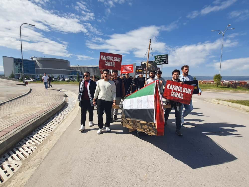 Üniversitemiz Merkez Kütüphane önünde başlayan yürüyüş, yoğun katılım eşliğinde İlahiyat Fakültesi önüne kadar sürdü. Ellerinde taşıdıkları pankartlar ve attıkları sloganlarla Filistin halkının sesi olmayı amaçlayan öğrenciler, “Kahrolsun İsrail” ve “Gazze yalnız değildir” gibi ifadelerle yaşananlara tepki gösterdi.