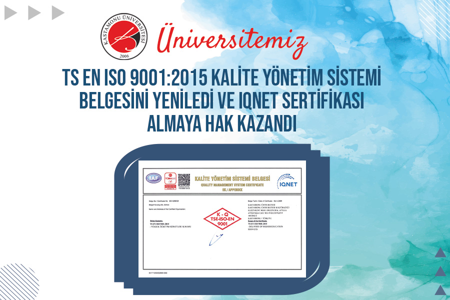 Kastamonu Üniversitesi, TS EN ISO 9001:2015 Kalite Yönetim Sistemi Belgesi’ni yeniledi ve IQNET Sertifikası almaya hak kazandı.