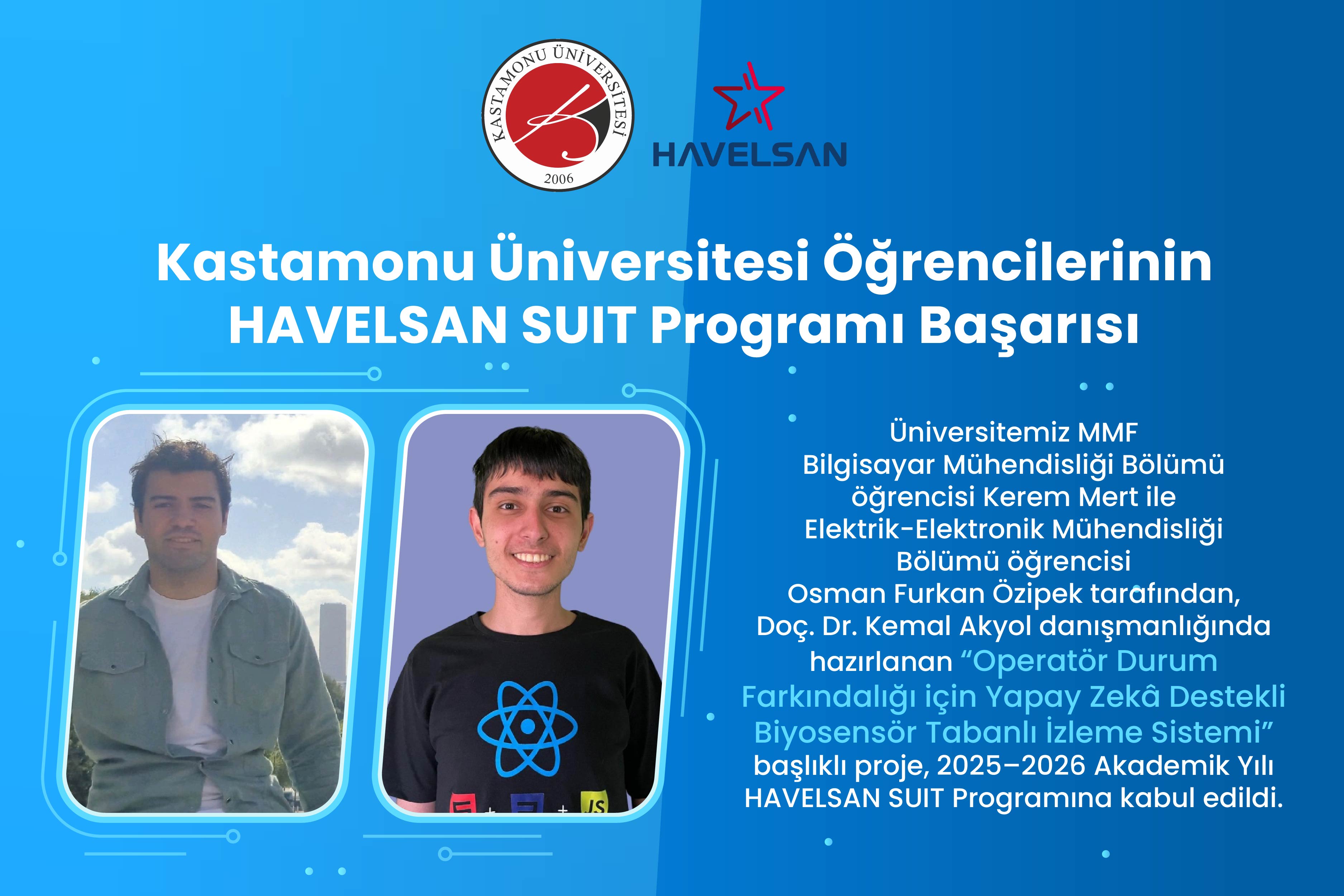 Kastamonu Üniversitesi Mühendislik ve Mimarlık Fakültesi öğrencileri, savunma ve teknoloji alanında prestijli bir başarıya daha imza attı. Bilgisayar Mühendisliği Bölümü öğrencisi Kerem Mert ile Elektrik-Elektronik Mühendisliği Bölümü öğrencisi Osman Furkan Özipek tarafından, Doç. Dr. Kemal Akyol danışmanlığında hazırlanan “Operatör Durum Farkındalığı için Yapay Zekâ Destekli Biyosensör Tabanlı İzleme Sistemi” başlıklı proje, 2025–2026 Akademik Yılı HAVELSAN SUIT Programına kabul edildi.