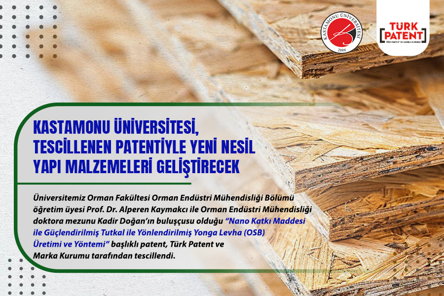 Kastamonu Üniversitesi Orman Fakültesi Orman Endüstri Mühendisliği Bölümü öğretim üyesi Prof. Dr. Alperen Kaymakcı ile Orman Endüstri Mühendisliği doktora mezunu Kadir Doğan’ın buluşçusu olduğu “Nano Katkı Maddesi ile Güçlendirilmiş Tutkal ile Yönlendirilmiş Yonga Levha (OSB) Üretimi ve Yöntemi” başlıklı patent, Türk Patent ve Marka Kurumu tarafından tescillendi.