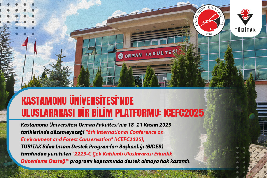 Kastamonu Üniversitesi Orman Fakültesi’nin 18–21 Kasım 2025 tarihlerinde düzenleyeceği "6th International Conference on Environment and Forest Conservation" (ICEFC2025), TÜBİTAK Bilim İnsanı Destek Programları Başkanlığı (BİDEB) tarafından yürütülen "2223-C Çok Katılımlı Uluslararası Etkinlik Düzenleme Desteği" programı kapsamında destek almaya hak kazandı. Bu destek, kongrenin ulusal ve uluslararası alanda tanınırlığını artırmakla birlikte, ormancılık ve çevre bilimleri alanlarındaki akademik çalışmaların gelişimine önemli katkılar sunmasına katkı sağlayacak.