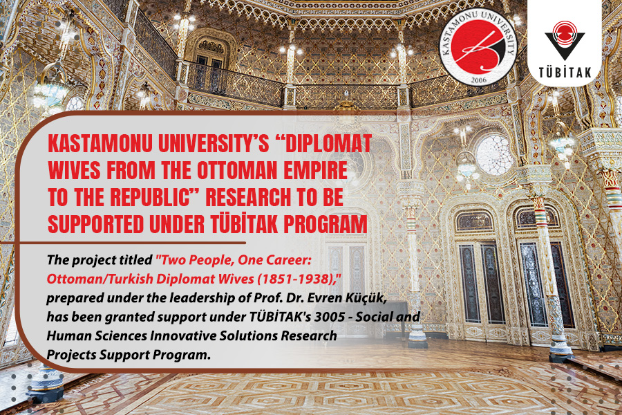 Kastamonu Üniversitesi İktisadi ve İdari Bilimler Fakültesi Uluslararası İlişkiler Bölümü öğretim üyesi Prof. Dr. Evren Küçük’ün yürütücülüğünde hazırlanan “İki Kişi Tek Kariyer: Osmanlı/Türk Diplomat Eşleri (1851-1938)” başlıklı proje, TÜBİTAK’ın 3005 - Sosyal ve Beşeri Bilimlerde Yenilikçi Çözümler Araştırma Projeleri Destekleme Programı kapsamında destek almaya hak kazandı.