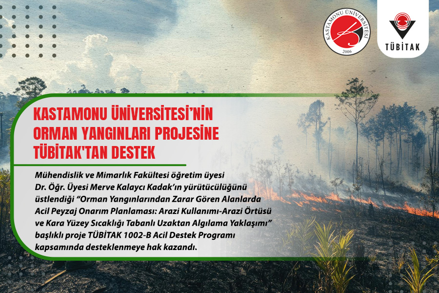Kastamonu Üniversitesi Mühendislik ve Mimarlık Fakültesi öğretim üyesi Dr. Öğr. Üyesi Merve Kalaycı Kadak’ın yürütücülüğünü üstlendiği “Orman Yangınlarından Zarar Gören Alanlarda Acil Peyzaj Onarım Planlaması: Arazi Kullanımı-Arazi Örtüsü ve Kara Yüzey Sıcaklığı Tabanlı Uzaktan Algılama Yaklaşımı” başlıklı proje TÜBİTAK 1002-B Acil Destek Programı kapsamında desteklenmeye hak kazandı.