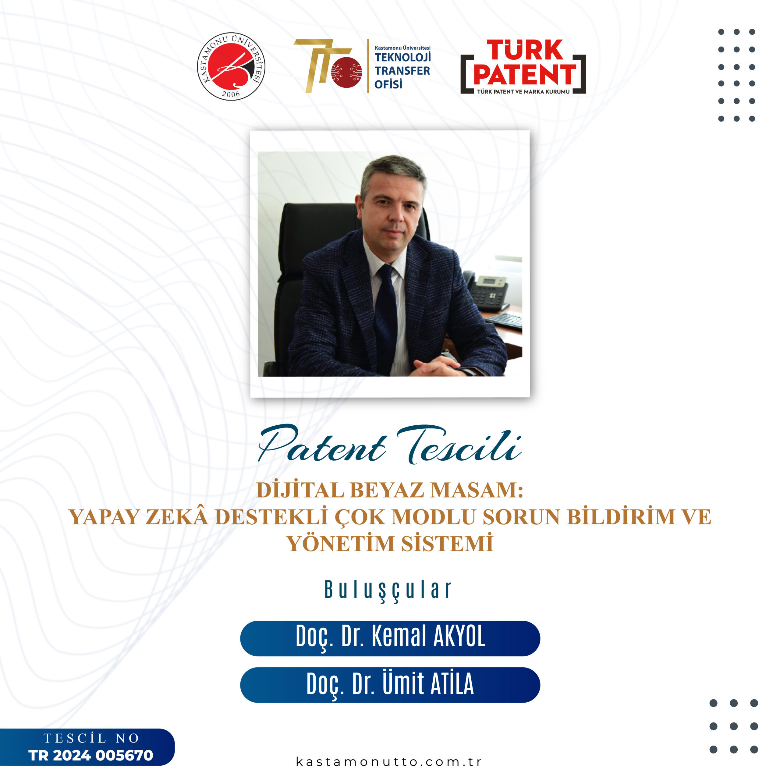 Kastamonu Üniversitesi hak sahipliğinde başvurusu yapılan, Mühendislik ve Mimarlık Fakültesi Bilgisayar Mühendisliği öğretim üyesi Doç. Dr. Kemal Akyol ile Gazi Üniversitesi Mühendislik Fakültesi Bilgisayar Mühendisliği öğretim üyesi Doç. Dr. Ümit Atila tarafından geliştirilen “Dijital Beyaz Masam: Yapay Zekâ Destekli Çok Modlu Sorun Bildirim ve Yönetim Sistemi” başlıklı buluş, Türk Patent ve Marka Kurumu tarafından tescillendi.