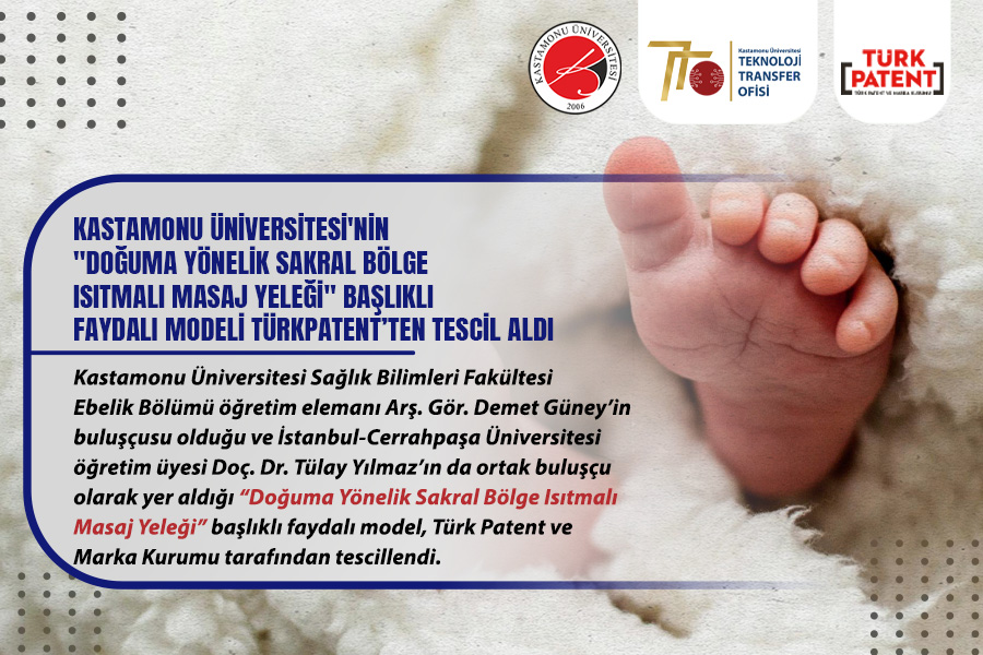 Kastamonu Üniversitesi Sağlık Bilimleri Fakültesi Ebelik Bölümü öğretim elemanı Arş. Gör. Demet Güney’in buluşçusu olduğu ve İstanbul-Cerrahpaşa Üniversitesi öğretim üyesi Doç. Dr. Tülay Yılmaz’ın da ortak buluşçu olarak yer aldığı “Doğuma Yönelik Sakral Bölge Isıtmalı Masaj Yeleği” başlıklı faydalı model, Türk Patent ve Marka Kurumu tarafından tescillendi.