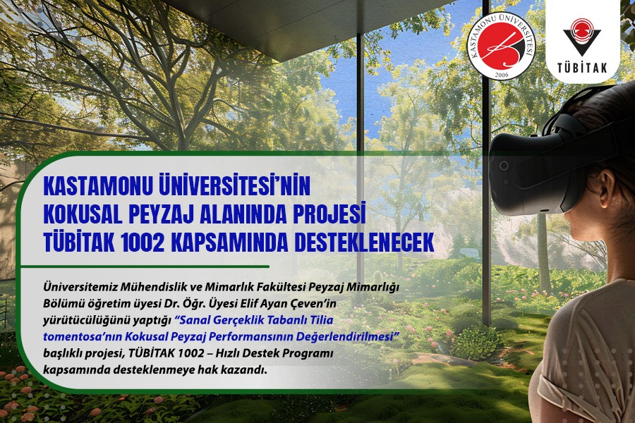 Kastamonu Üniversitesi Mühendislik ve Mimarlık Fakültesi Peyzaj Mimarlığı Bölümü öğretim üyesi Dr. Öğr. Üyesi Elif Ayan Çeven’in yürütücülüğünü yaptığı “Sanal Gerçeklik Tabanlı Tilia tomentosa’nın Kokusal Peyzaj Performansının Değerlendirilmesi” başlıklı projesi, TÜBİTAK 1002 – Hızlı Destek Programı kapsamında desteklenmeye hak kazandı.