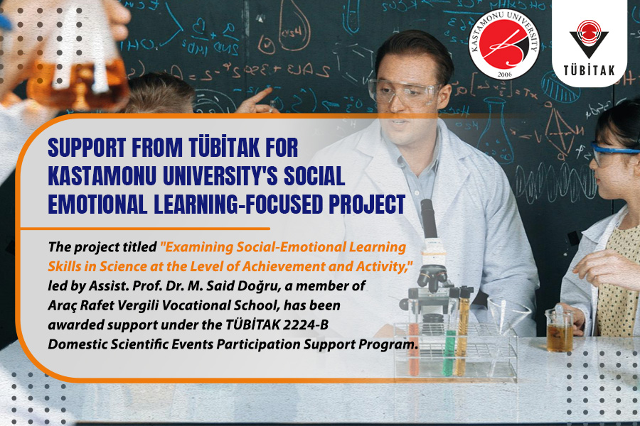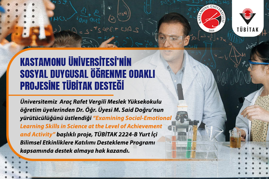 Kastamonu Üniversitesi Araç Rafet Vergili Meslek Yüksekokulu öğretim üyelerinden Dr. Öğr. Üyesi M. Said Doğru’nun yürütücülüğünü üstlendiği “Examining Social-Emotional Learning Skills in Science at the Level of Achievement and Activity” başlıklı proje, TÜBİTAK 2224-B Yurt İçi Bilimsel Etkinliklere Katılımı Destekleme Programı kapsamında destek almaya hak kazandı.