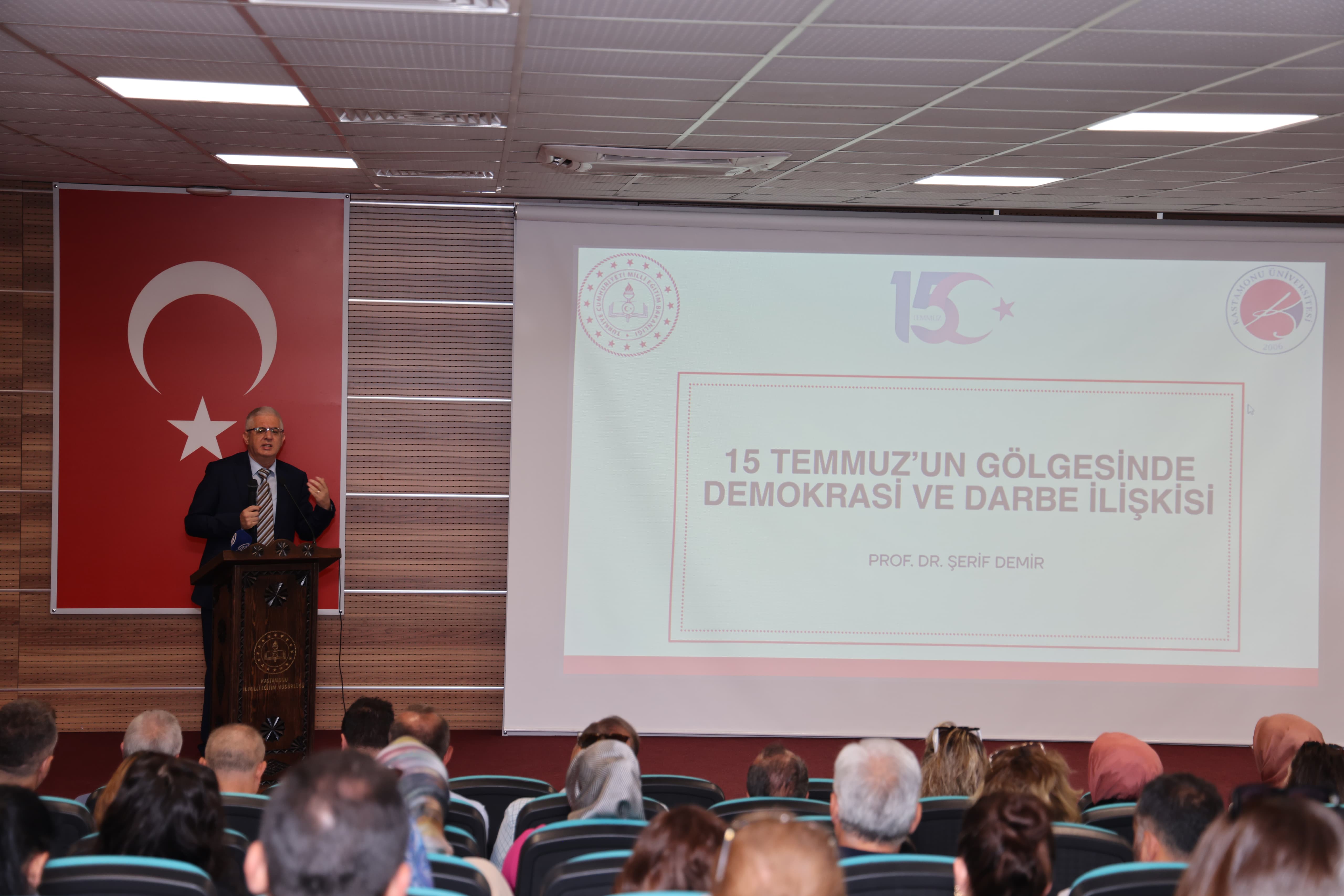 11 Temmuz 2025 tarihinde İl Milli Eğitim Müdürlüğü Konferans Salonu’nda gerçekleştirilen programda konuşan Prof. Dr. Demir, yaklaşık 30 yıldır darbeler ve Demokrat Parti üzerine akademik çalışmalar yürüttüğünü belirterek, hiçbir darbenin meşrulaştırılamayacağını vurguladı.